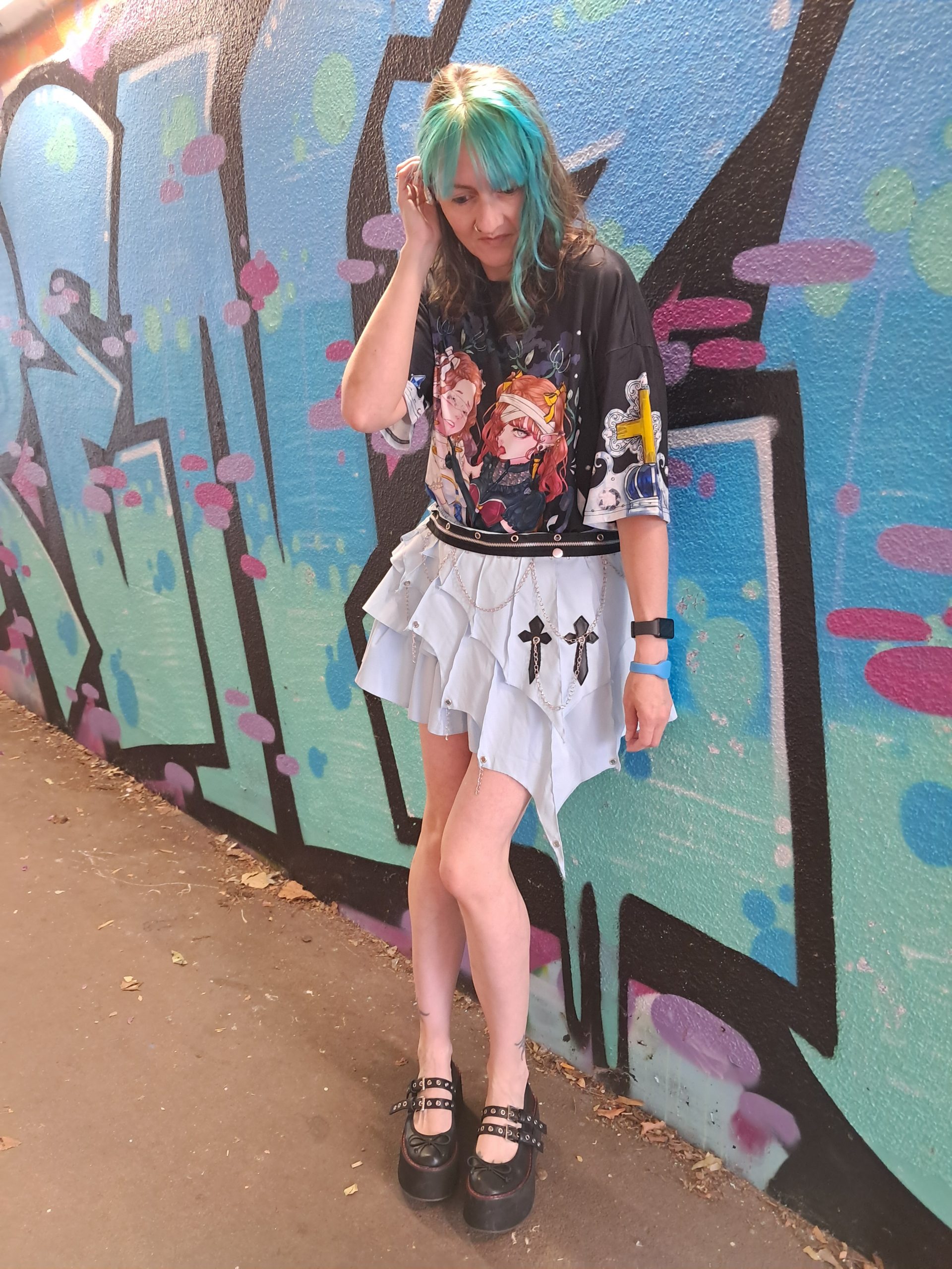 This beautiful 3 layer pastel mini skirt is cute but with a punk edge in the detailing. The top layer can also be removed so this can be worn as a plain skirt if desired.